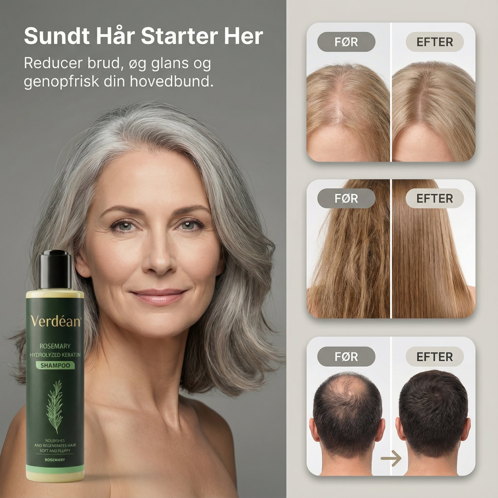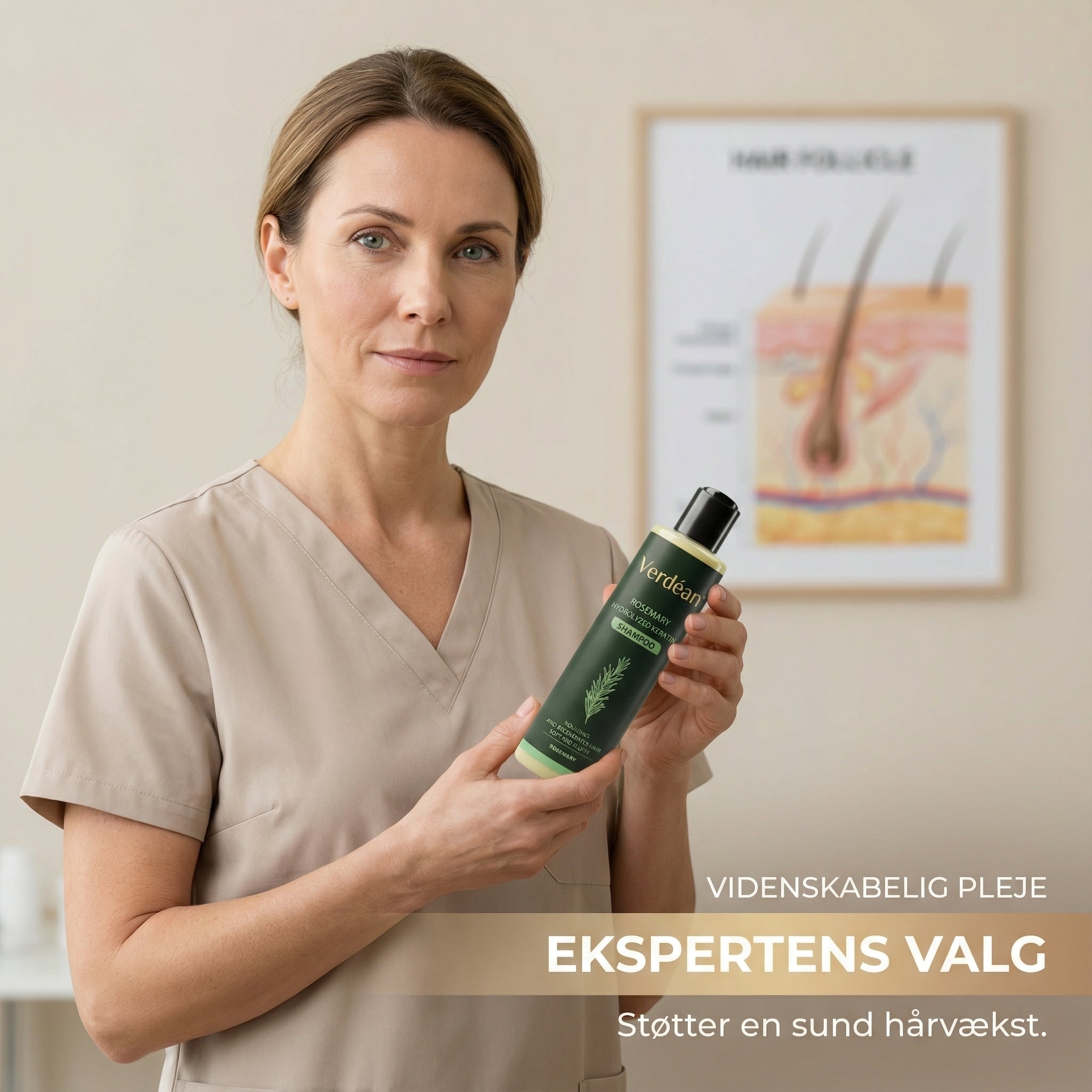 “Rosmarin er kendt for sine plejende egenskaber og sin evne til at støtte en sund hovedbund. Det kan bidrage til at skabe bedre betingelser for hårets naturlige balance ved at understøtte cirkulationen i hovedbunden og pleje hårsækkene. Ved regelmæssig brug kan en veludviklet formel med rosmarin hjælpe med at styrke håret, mindske skrøbelighed og give håret et sundere og mere fyldigt udseende. Verdéan™ Rosemary Keratin Shampoo kombinerer disse egenskaber i en skånsom, men effektiv shampoo, der er velegnet til daglig pleje af både hår og hovedbund.”